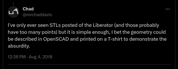 In 2018 while the modern era of functional 3D-printable firearms was getting its feet, and before the "creator" of the Liberator and founder of Defense Distributed was charged with child sex crimes, this design lauded as the first 3D printable gun was at the forefront publicly pushing the envelope on "3D blueprints" of guns as Free Speech.